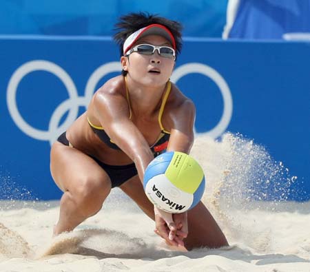 China's Wang Jie dives to return the ball to Xue Chen and Zhang Xi in their women's semifinal beach volleyball match at Beijing's Chaoyang Park Beach Volleyball Ground on August 19, 2008 during the 2008 Beijing Olympic Games. Chinese duo Tian Jia and Wang Jie will meet American defending Olympic champions Kerri Walsh and Misty May-Treanor in the final. [Agencies]