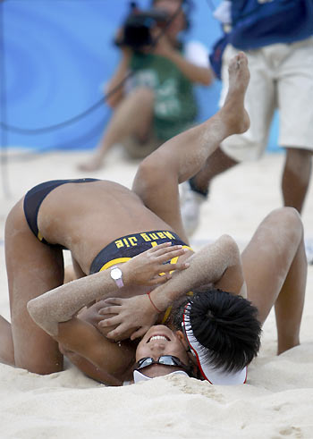 Tian Jia and Wang Jie (top) of China celebrate winning their women's beach volleyball semifinal match against Xue Chen and Zhang Xi of China at the Beijing 2008 Olympic Games August 19, 2008. The Chinese pair will meet defending Olympic champions Kerri Walsh and Misty May-Treanor of the United States in the final to be held on Thursday. [Agencies]