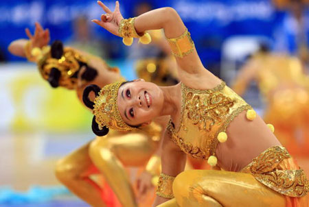 Cheerleaders perform during the men's preliminary round group B basketball match China vs. Greece at the Beijing Olympic Basketball Gymnasium on August 18, 2008. China lost 91-77 to Greece. [sina.com.cn]
