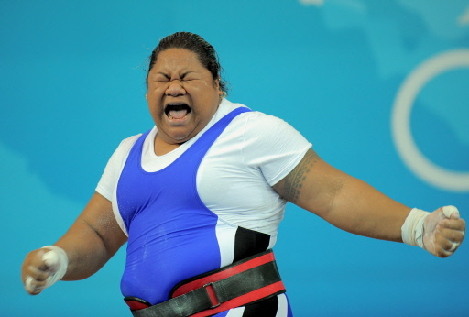 Ele Opeloge of Samoa reacts after a lift in the women's +75 kg weightlifting event during the 2008 Beijing Olympic Games on August 16, 2008. [Agencies]
