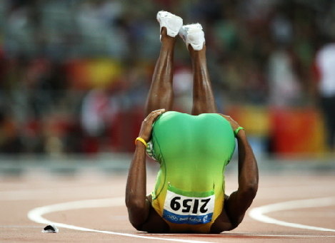Jamaica's Markino Buckley reacts after finishing third in the men's 400m hurdles semi-final 2 at the "Bird's Nest" National Stadium as part of the 2008 Beijing Olympic Games on August 16, 2008. Kerron Clement of the US finished first followed by Jamaica's Danny McFarlane and Buckley respectively. [Agencies]