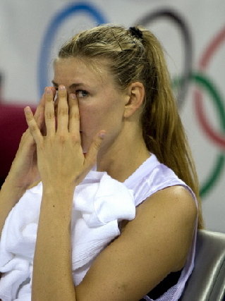 Latvia's basketball player Dita Krumberga reacts after loosing a preliminary round group A basketball macth of the 2008 Beijing Olympic Games against Korea at the Olympic Basketball Arena in Beijing on August 16, 2008. Korea won 72/ 68. [Agencies]