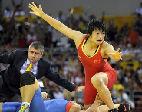 China's Wang Jiao (R) reacts as she wins her fight against Bulgaria's Stanka Zlateva (on ground) in the wrestling women's 72kg freestyle of the 2008 Beijing Olympic Games on August 17, 2008 at the China Agricultural University Gymnasium in Beijing. China's world junior champion Wang Jiao beat two-time world senior champion Stanka Zlateva of Bulgaria to win the Olympic women's wrestling 72kg. [Agencies]