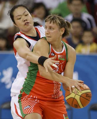 Olga Masilionene of Belarus (R) is guarded by Chen Xiaoli of China during their women's quarterfinal basketball game at the Beijing 2008 Olympic Games August 19, 2008. [Agencies]