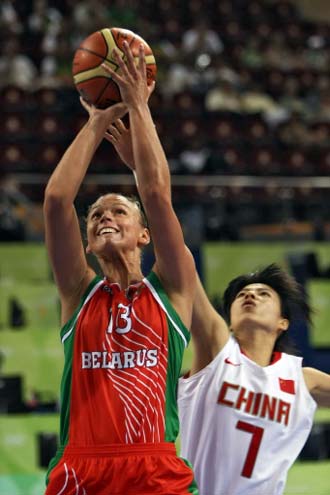 Belarus's Tatyana Troina (L) goes for a basket next to China's Wei Zhang during their women's quarter-final basketball match China vs. Belarus at the Olympic basketball gymnasium on August 19, 2008 in Beijing, as part of the 2008 Beijing Olympic Games. [Agencies]
