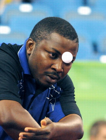 Monday Merotohun of Nigeria plays against Zeng Cem of Turkey during the men's table tennis singles preliminary round of the 2008 Beijing Olympic Games at the Peking University gymnasium in Beijing on August 19, 2008.[Agencies]