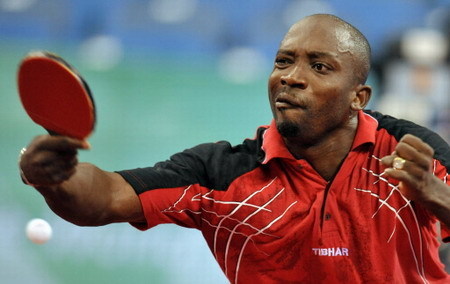 Nigeria's Segun Toriola hits a return to US David Zhuang during their men's table tennis single preliminary match as part of the 2008 Beijing Olympic Games on August 19, 2008 at the Peking University gymnasium in Beijing .[Agencies]