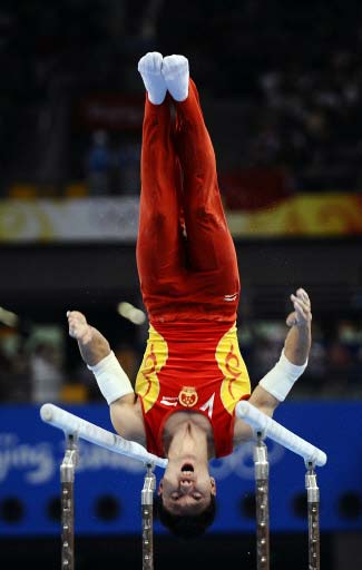 China's Li Xiaopeng competes in the men's parrallel bars final of the artistic gymnastics event of the Beijing 2008 Olympic Games in Beijing on August 19, 2008. China's Li Xiaopeng won the gold, South Korea's Yoo Wonchul the silver and Uzbekistan's Anton Fokin the bronze. [Agencies]