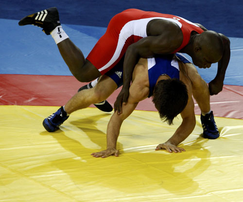 Yandro Quintana of Cuba (in red) fights Mavlet Batirov of Russia during their 60kg men's freestyle wrestling 1/8 finals match at the Beijing 2008 Olympic Games August 19, 2008.[Agencies]