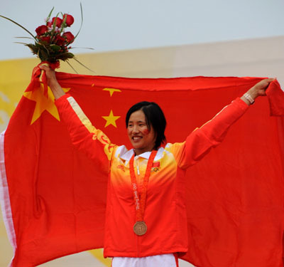 Sailor Xu Lijia of China celebrates her bronze medal win in the Laser Radial class race in the medals ceremony at the 2008 Beijing Olympic Games August 19, 2008 in Qingdao, China.[Agencies]