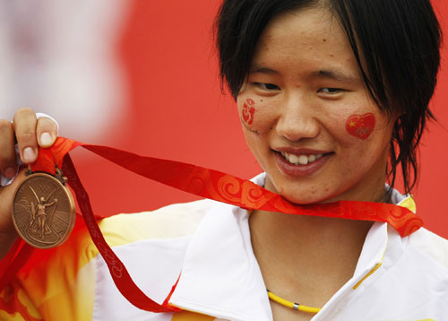 Xu Lijia of China poses with her bronze medal after the Laser Radial class sailing competition during the Beijing 2008 Olympic Games in Qingdao, Shandong province, August 19, 2008.[Agencies]