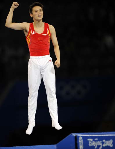 China's Lu Chunlong celebrates at the end of the men's trampoline final of the artistic gymnastics event of the Beijing 2008 Olympic Games in Beijing on August 19, 2008. China's Lu Chunlong won the gold, Canada's Jason Burnett the silver and China's Dong Dong the bronze. [Agencies]