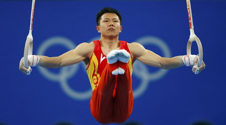 Chen Yibing of China competes in the men's rings final during the artistic gymnastics competition at the Beijing 2008 Olympic Games August 18, 2008. [Agencies]