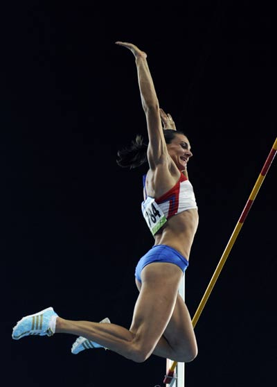 Isinbayeva of Russia jumps to break the world record during the women's pole vault final in in the National Stadium at the Beijing 2008 Olympic Games.