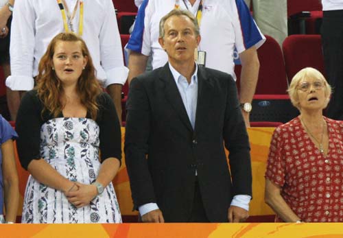 Former British premier Tony Blair (C) sings his national anthem at the Laoshan Velodrome in Beijing on August 19, 2008 during the track cycling sessions of the 2008 Beijing Olympic Games. [Agencies]