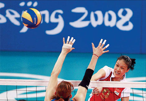 Zhao Ruirui of China smashes the ball past Russia's Natalia Alimova during the match August 19 2008. [China Daily]