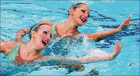 Apolline Dreyfuss and Lila Meessemann-Bakir of France perform in the synchronized swimming duet free routine preliminary round August 19 2008. [Agencies]