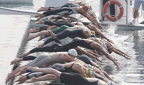 Swimmers dive into the water to start the women's marathon 10km swimming competition at the Beijing 2008 Olympic Games in Beijing, August 20, 2008. [Agencies]