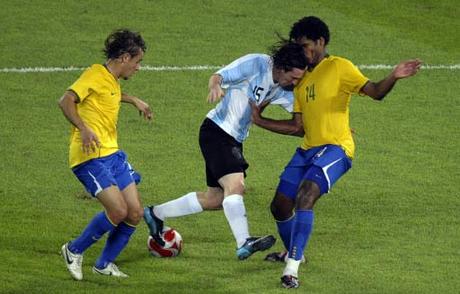 Breno (R) and Rafina of Brazil vies with Lionel Messi (C) of Argentina during the 2008 Beijing Olympic Games semi-finals men's football match at the Worker's Stadium in Beijing on August 19, 2008.[Agencies]