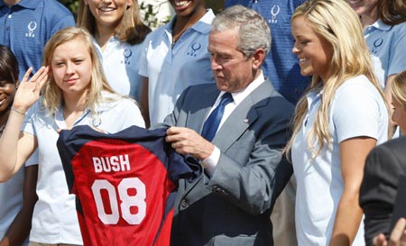 US President George W. Bush holds up a softball jersey presented to him by US Olympic softball player Jennie Finch (R) at a photo opportunity with US Olympic athletes bound for Beijing in the Rose Garden of the White House in Washington, July 21, 2008. [Agencies]