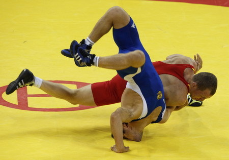 Mavlet Batirov of Russia (in blue) fights Vasyl Fedoryshyn of Ukraine during their 60kg men's freestyle wrestling final match at the Beijing 2008 Olympic Games August 19, 2008. [Agencies]