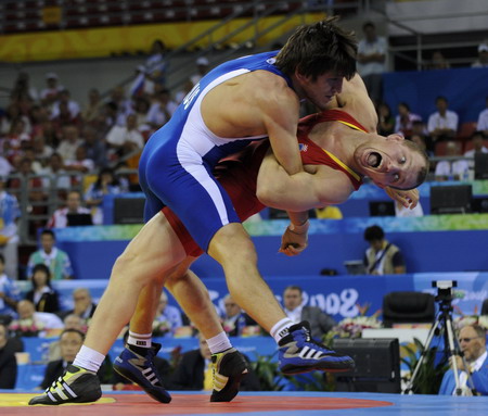 Mavlet Batirov of Russia (in blue) fights Vasyl Fedoryshyn of Ukraine during their 60kg men's freestyle wrestling final match at the Beijing 2008 Olympic Games August 19, 2008. [Agencies]
