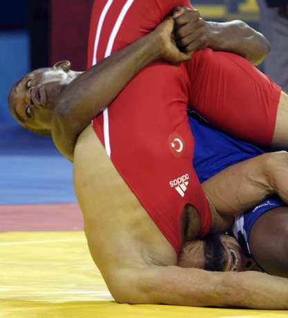 Turkey's Ramazan Sahin (red) grapples with Cuba's Geandry Garzon during their men's 66kg freestyle 1/8 final wrestling match at the 2008 Beijing Olympic Games on August 20, 2008. [Agencies]