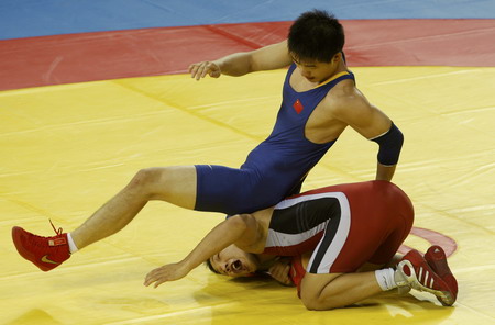 Wang Quiang of China (in blue) fights Leonid Spiridonov of Kazakhstan during their 66kg men's freestyle wrestling qualification match at the Beijing 2008 Olympic Games August 20, 2008. [Agencies]