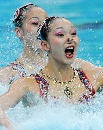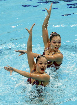 Jiang Tingting and Jiang Wenwen of China perform in the duet synchronised swimming technical routine at the Beijing 2008 Olympic Games August 18, 2008. [Agencies]