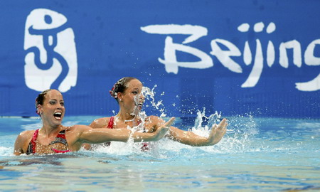 Sonja and Bianca van der Velden of Netherlands perform in the synchronised swimming duet free routine preliminary round at the Beijing 2008 Olympic Games August 19, 2008. [Agencies]