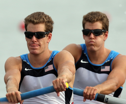 America's Tyler Winklevoss and Cameron Winklevoss power at the start of the men's pair final at the Shunyi Rowing and Canoeing Park during the 2008 Beijing Olympic Games in Beijing on August 16, 2008. [Agencies]
