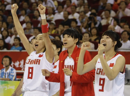 China's Zhang Wei (C) and Zhang Yu celebrate their victory over Belarus after their women's quarterfinal basketball game at the Beijing 2008 Olympic Games August 19, 2008. [Agencies]