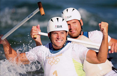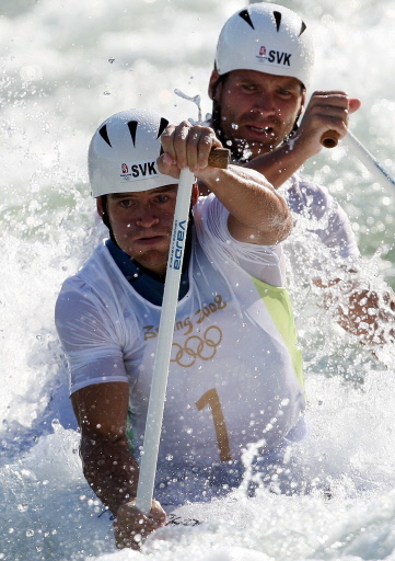 Pavol Hochschorner (L) and Peter Hochschorner of Slovakia compete in the 2008 Beijing Olympic Games Men's doubles Canoe C2 slalom final at the Shunyi Rowing and Canoeing Park in Beijing on August 15, 2008. Slovakia won the gold , with Czech Republic taking the silver and Russia claiming the Bronze. [Agencies]
