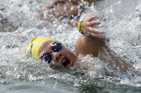 South Africa's Natalie du Toit swims in the Women's 10km Marathon at the 2008 Beijing Olympic Games at the Shunyi Rowing and Canoeing Park in Beijing on August 19, 2008. Russia's Larisa Ilchenko won the gold medal, with Great Britain's Keri-Anne Payne and Cassandra Patten claiming the silver and bronze respectively. [Agencies]