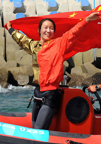 China's Yin Jian celebrates after winning RS:X Women at the Olympic Sailing Regatta in Qingdao on Wednesday. [Xinhua]