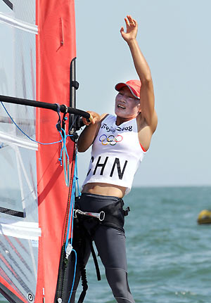 China's Yin Jian celebrates after winning RS:X Women at the Olympic
