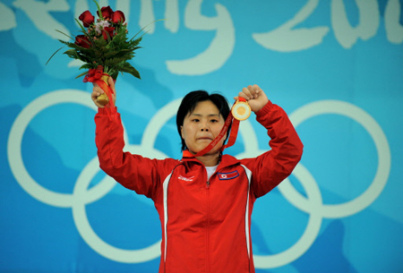 Pak Hyon Suk of the Democratic People's Republic of Korea poses on the podium during the award ceremony for the women's 63 kg weightlifting event at the 2008 Beijing Olympic Games on August 12, 2008. [Agencies]