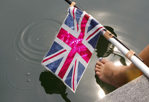 A woman from the British team, with a pole used for giving drinks to the swimmers, dips her toes in the water during the women's marathon 10km swimming competition at the Beijing 2008 Olympic Games, August 20, 2008.[Agencies]