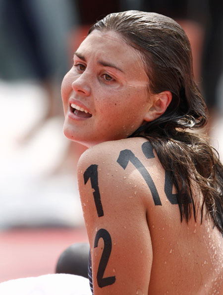 Larisa Ilchenko of Russia celebrates after winning the women's marathon 10km swimming competition at the Beijing 2008 Olympic Games August 20, 2008.[Agencies]