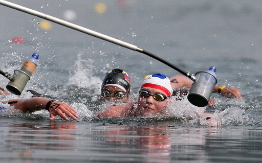 Britain's Cassandra Patten (R) prepares to drink water while competing the Women's Swimming 10 km marathon final of the 2008 Beijing Olympic Games at the Shunyi Rowing and Canoeing Park in Beijing on August 20, 2008.[Agencies]