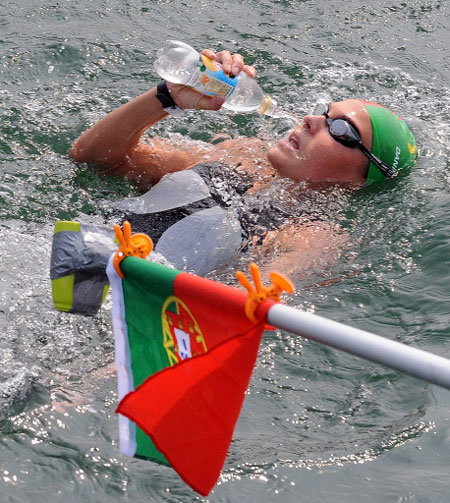 Portugal's Daniela Inacio drinks water while competing in the Women's Swimming 10 km marathon final of the 2008 Beijing Olympic Games at the Shunyi Rowing and Canoeing Park in Beijing on August 20, 2008.[Agencies]