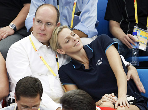 Prince Albert of Monaco and his friend Charlene Wittstock attend the synchronised swimming duet free routine final at the Beijing 2008 Olympic Games August 20, 2008. Wittstock is a former South African Olympic swimmer. [Agencies]