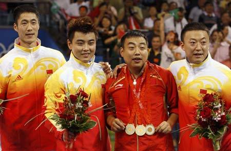 Gold medallists Ma Lin (R), Wang Hao (2nd L) and Wang Liqin (L) of China celebrate with their coach after winning their men's team table tennis final against Germany at the Beijing 2008 Olympic Games August 18, 2008. [Agencies]