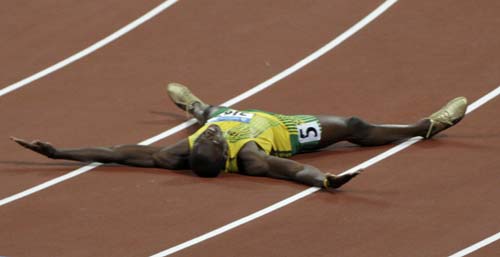 Usain Bolt of Jamaica celebrates after winning the men's 200m final of the athletics competition in the National Stadium at the Beijing 2008 Olympic Games August 20, 2008. Bolt set a new world record with a timing of 19.30 seconds. [Agencies]