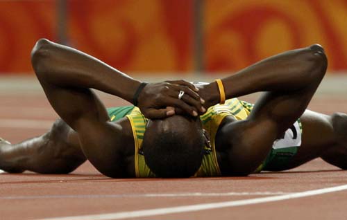 Usain Bolt of Jamaica celebrates after winning the men's 200m final of the athletics competition in the National Stadium at the Beijing 2008 Olympic Games August 20, 2008. Bolt set a new world record with a timing of 19.30 seconds. [Agencies]