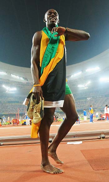 Usain Bolt of Jamaica celebrates after winning the men's 200m final of the athletics competition in the National Stadium at the Beijing 2008 Olympic Games August 20, 2008. Bolt set a new world record with a timing of 19.30 seconds. [Agencies]
