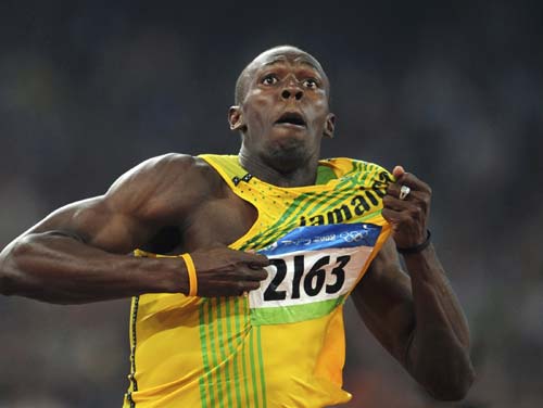 Usain Bolt of Jamaica celebrates after winning the men's 200m final of the athletics competition in the National Stadium at the Beijing 2008 Olympic Games August 20, 2008. Bolt set a new world record with a timing of 19.30 seconds. [Agencies]