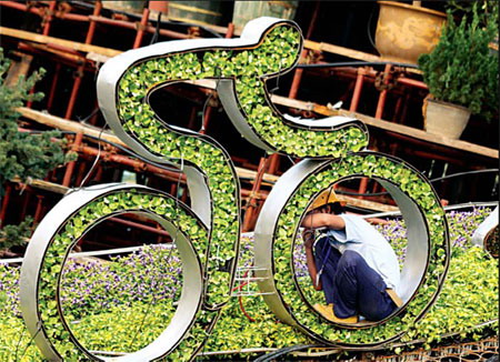 A worker fixes a "green" cyclist at Tian'anmen Square to celebrate the Olympic Games. [China Daily]