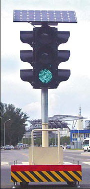 A movable solar-powered traffic light near the Olympic Sports Center. [China Daily]