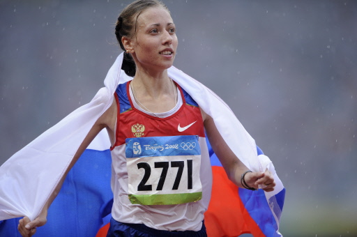 Russia's Olga Kaniskina celebrates after winning the women's 20km walk at the National Stadium in the 2008 Beijing Olympic Games on August 21, 2008. Russia's Olga Kaniskina won ahead of Norway's Kjersti Tysse Platzer and Italy's Elisa Rigaudo.[Agencies]